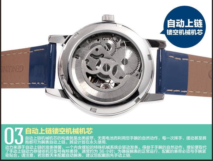 1.皮质的手表应尽量避免接触到水,以免表带变硬、发臭,进而导致断裂的结果。 尤其是汗水比较多的朋友,最好不要佩戴进行运动或夏天室外佩戴机械全自动表必須在活动量足够的情況下,即每日必须佩戴10小时以上,方可正常运转。