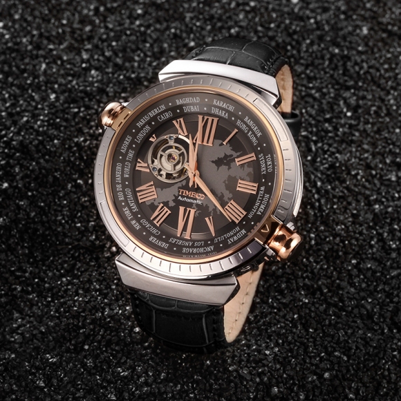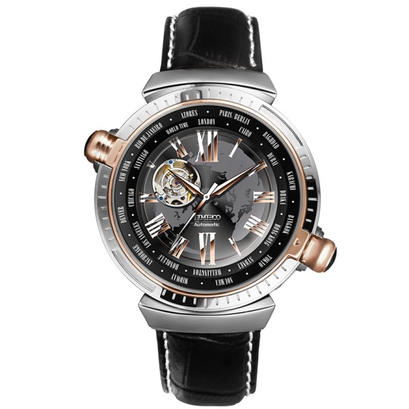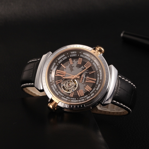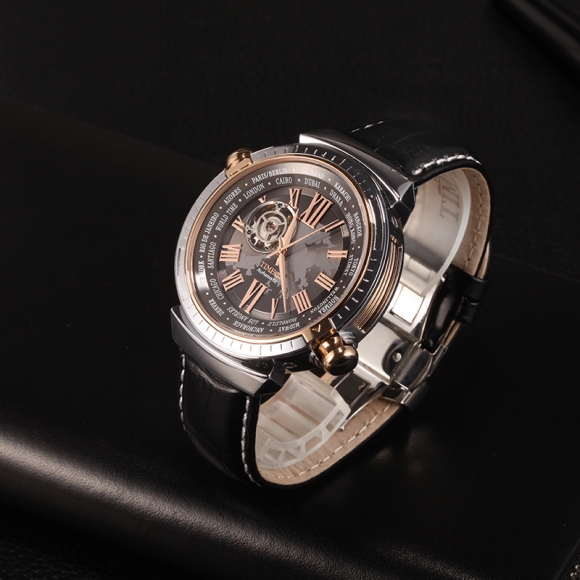 先机系列 世界时区镂空全自动真皮机械表男表 香港钟表设计大赛获奖作品,巴塞尔参展手表