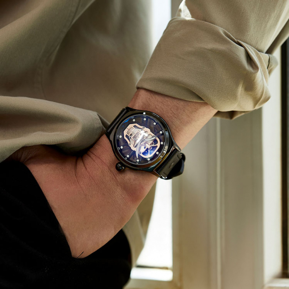 时光一百(TIME100)手表男时尚个性骷髅鬼脸弯刀镂空蓝色镀膜玻璃镜面男士手表车缝线牛皮圆盘防水男表